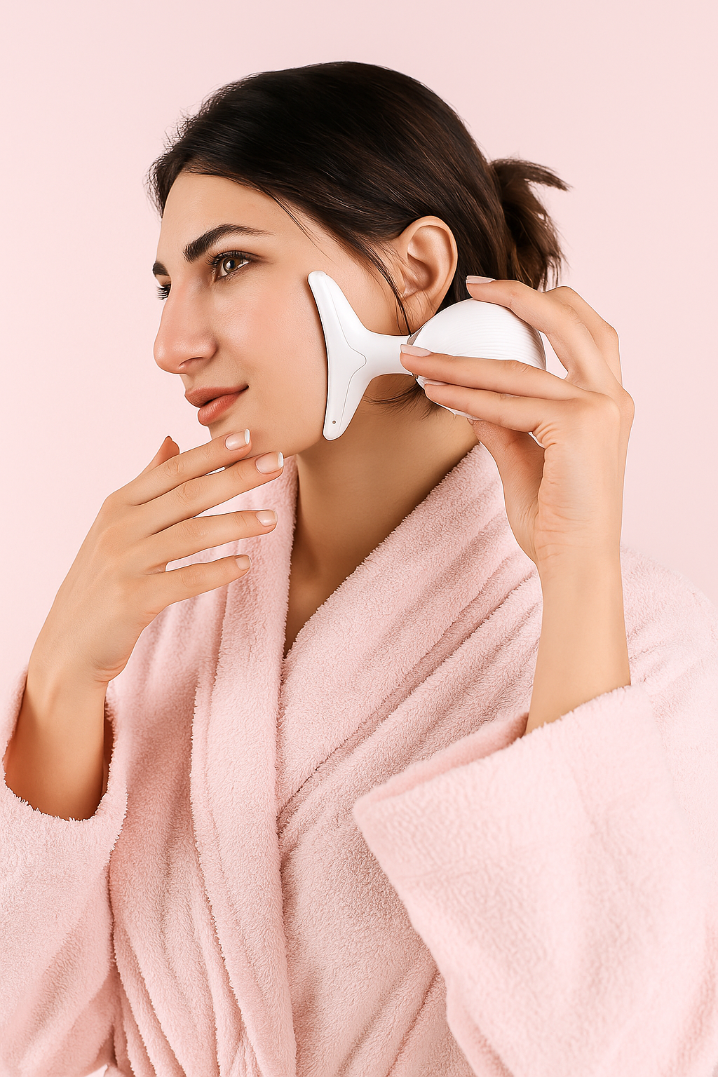 Appareil 3-en-1 pour nettoyer, raffermir et raviver le visage & le cou avec technologie EMS et thérapie lumineuse.